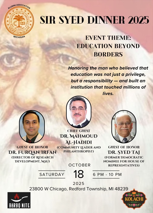 Honoring the man who believed education was not just a privilege but a responsibility — and built an institution that touched millions of lives. Join us for an evening of reflections on the Aligarh Movement, community initiatives, dinner, and Bollywood music entertainment.