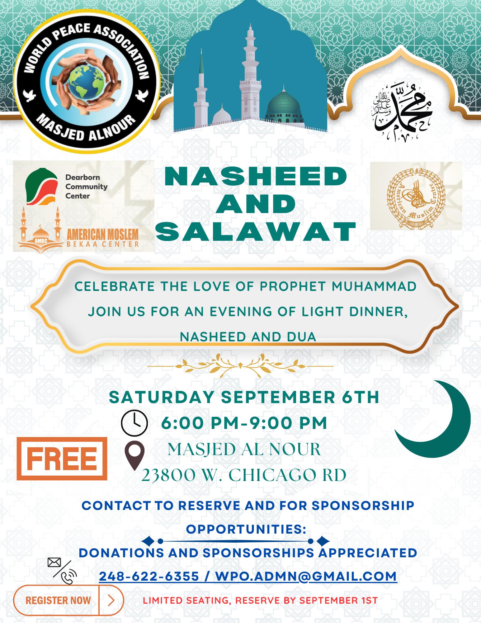 Celebrate the love of Prophet Muhammad ﷺ with an evening of nasheed, salawat, dua, and a light dinner. Join us Saturday, September 6th, 6–9 PM at Masjed Al Nour, 23800 W. Chicago Rd. Free entry — limited seating, reserve by September 1st.