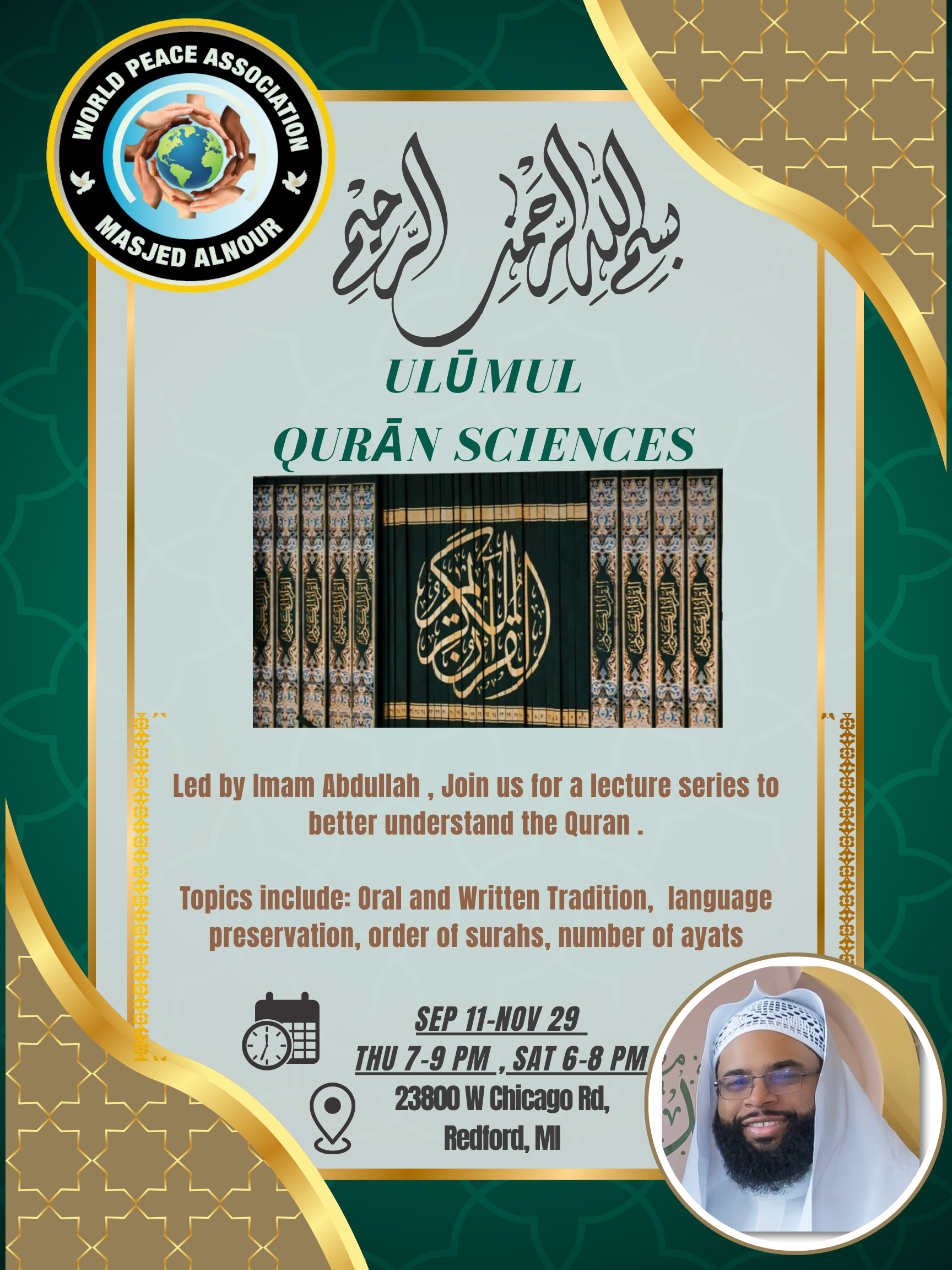 Led by Imam Abdullah, this weekly lecture series explores the sciences of the Qur’an: oral and written tradition, language preservation, order of surahs, and number of ayats. Join us Thursdays 7–9 PM and Saturdays 6–8 PM, Sep 11 – Nov 29 at Masjed Al Nour, 23800 W. Chicago Rd, Redford, MI.