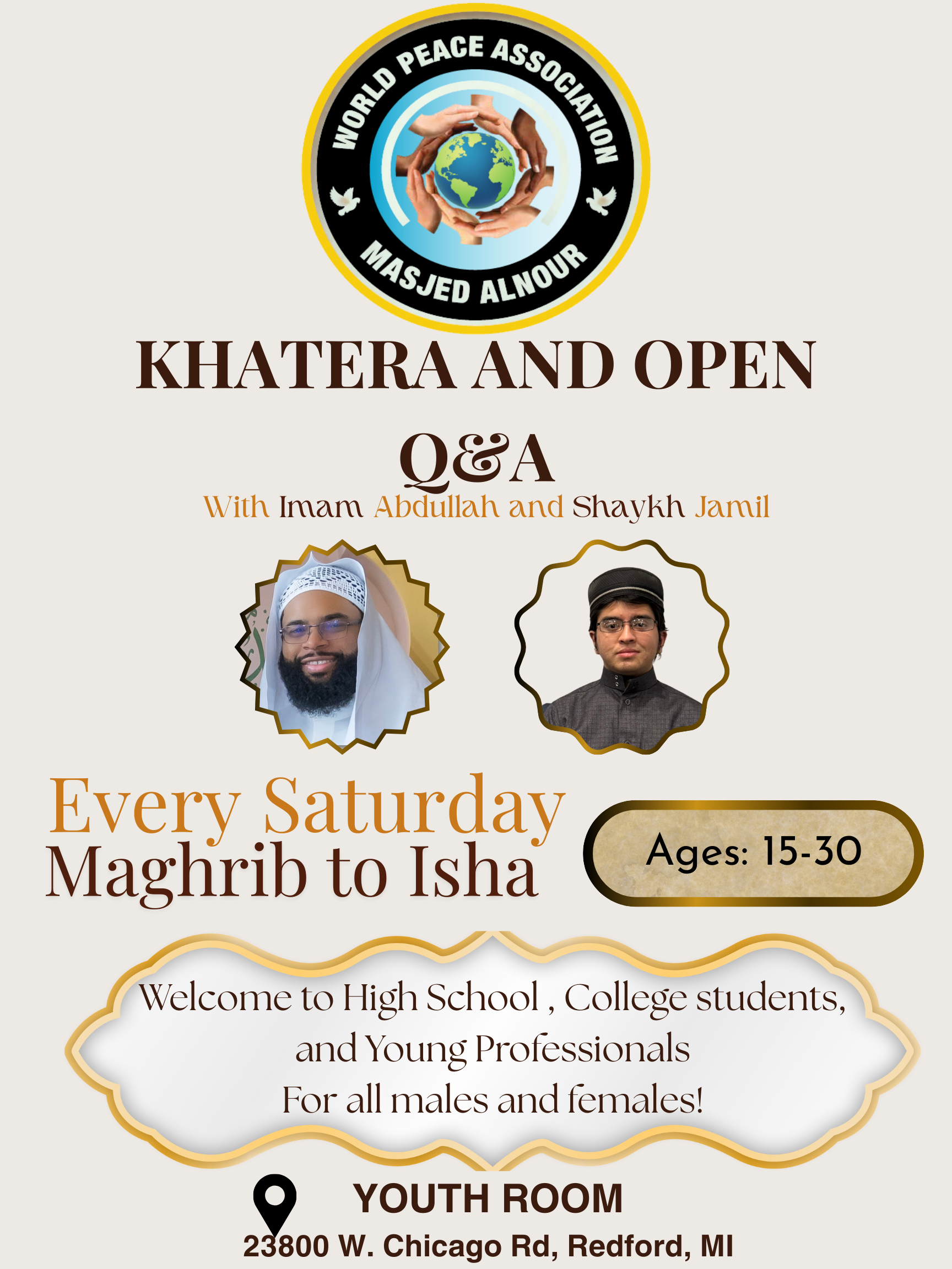 Led by Imam Abdullah, this weekly lecture series explores the sciences of the Qur’an: oral and written tradition, language preservation, order of surahs, and number of ayats. Join us Thursdays 7–9 PM and Saturdays 6–8 PM, Sep 11 – Nov 29 at Masjed Al Nour, 23800 W. Chicago Rd, Redford, MI.