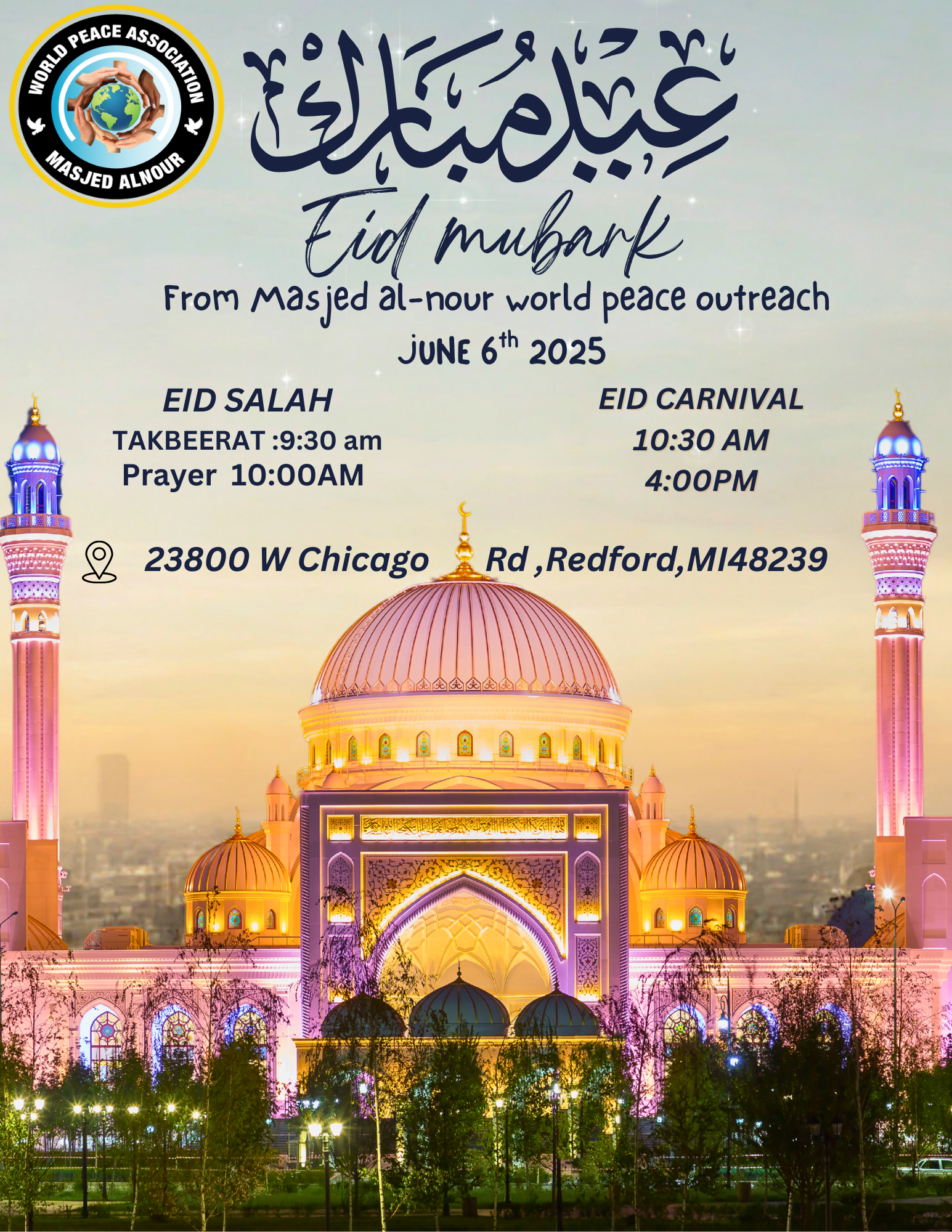 Eid Mubarak to the World Peace Outreach community. Please join us for Eid Salah and Takbeerat.