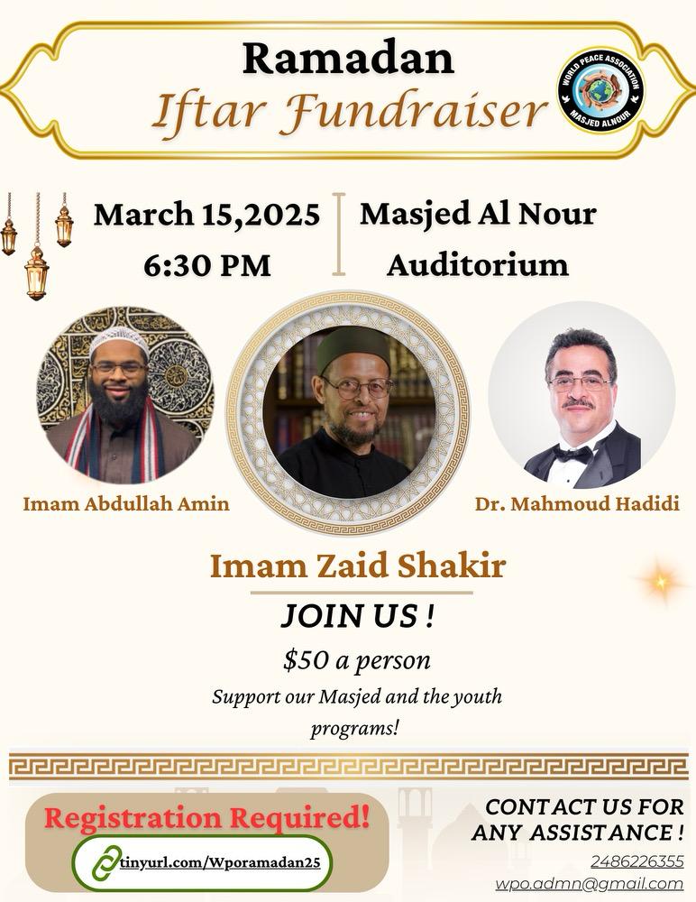 Join us for a captivating iftar fundraiser with world renowned Imam Zaid Shakir. To register, please click the link and checkout with a payment amount of 50 dollars. Jazak Allah Khair.🌟
