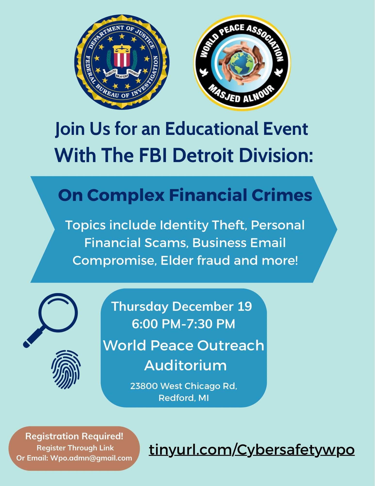 Join the FBI Detroit Division for an educational event at the World Peace Outreach Auditorium in Redford, MI. Learn how to recognize and prevent financial crimes like identity theft, elder fraud, and modern scams.