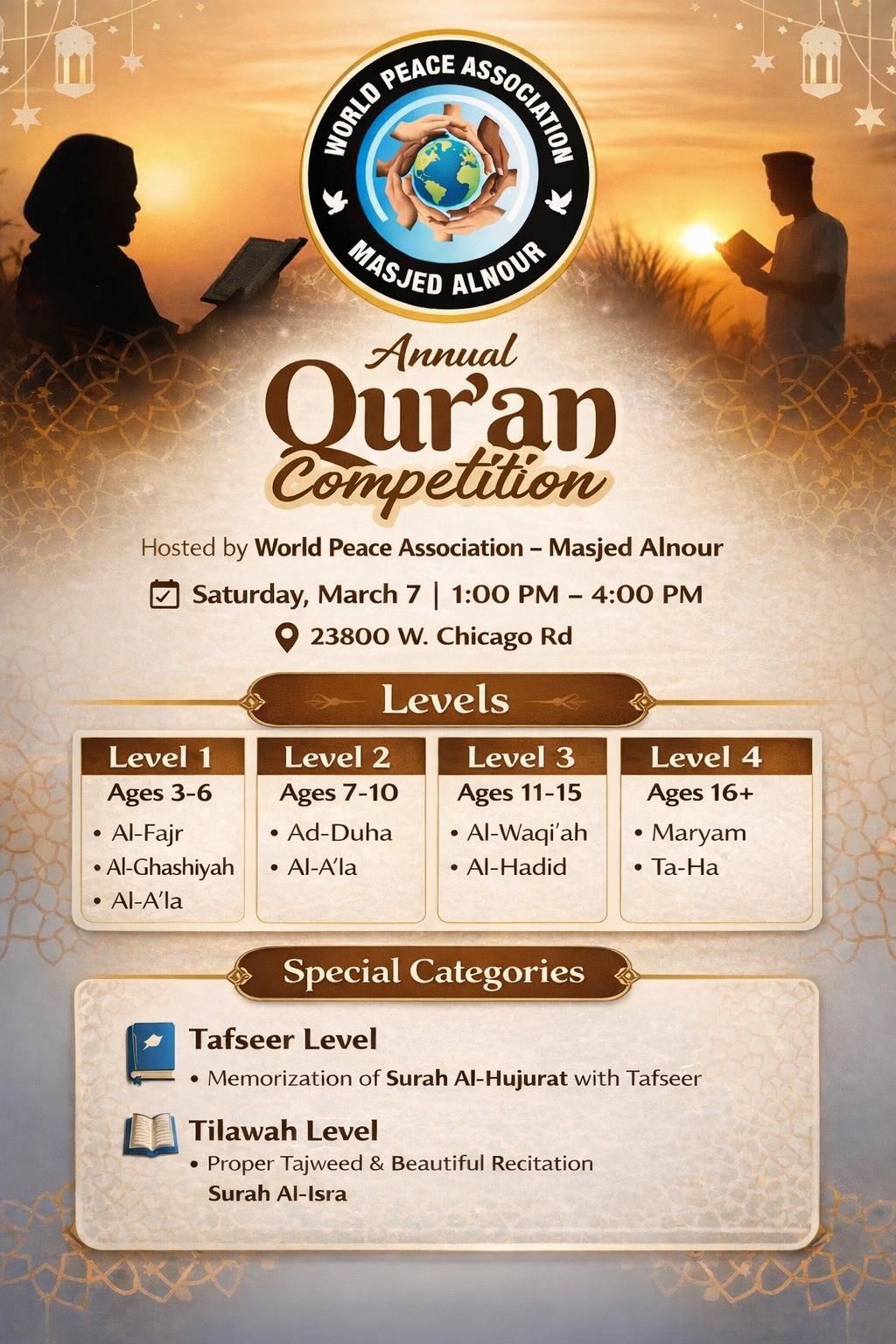 This course is hosted by World Peace Association / Masjed Al Nour and is open to all seeking to strengthen their Tajweed knowledge.